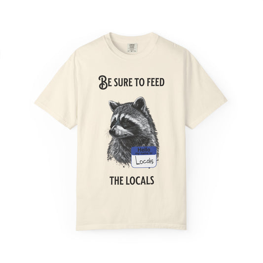 Be Sure to Feed the Locals T-Shirt — Raccoon Graphic Tee with "Hello, I'm Locals" Name Tag