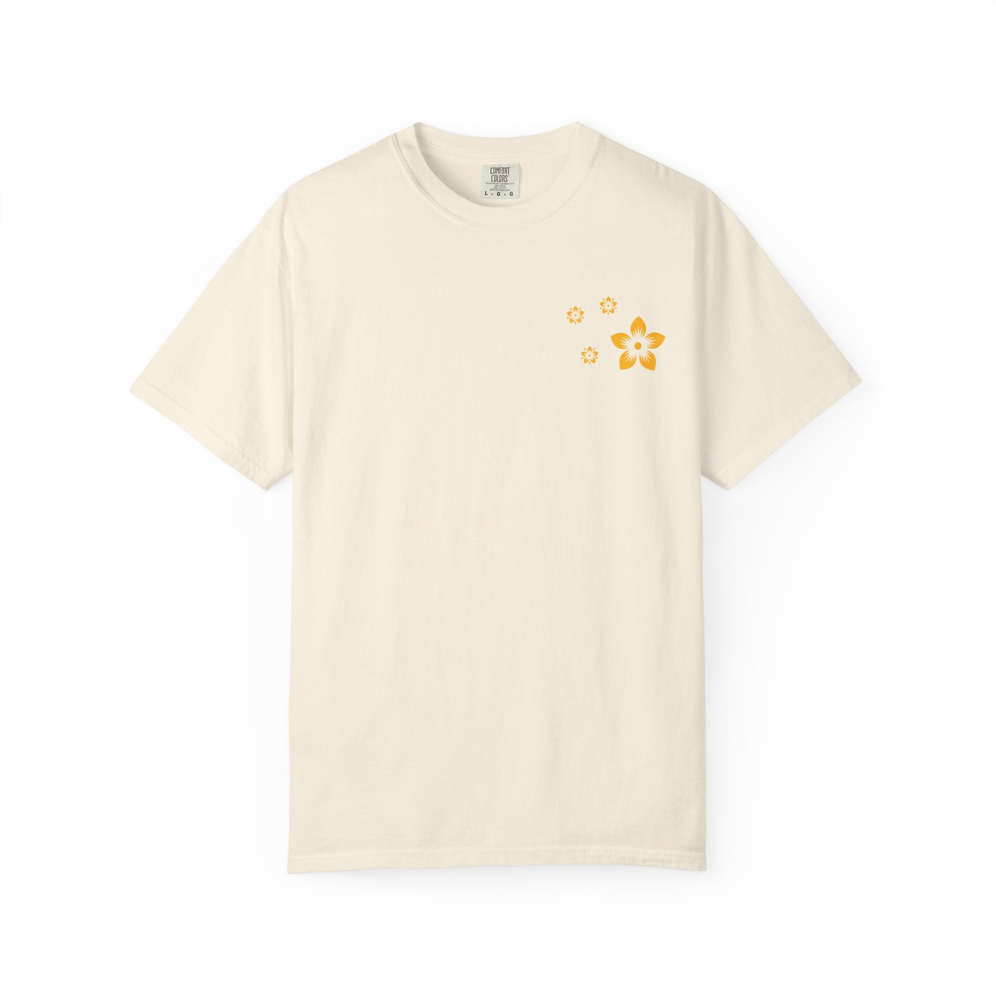 A soft, garment-dyed tee that reads like a quiet moment in bloom. Delicate gold blossoms and inked branch silhouettes sit within a clean rectangular frame on the back, with a tiny cluster of flowers at the chest — subtle, thoughtful, and easy to wear. The heavyweight cotton drapes with a relaxed fit and the post-dye finish gives each shirt a lived-in softness and slightly vintage tone. Wear it on slow mornings, at weekend markets, or layered under an open jacket for evenings by the river. It’s made to age gracefully and become one of those shirts you reach for when you want calm and a little warmth in your wardrobe.
